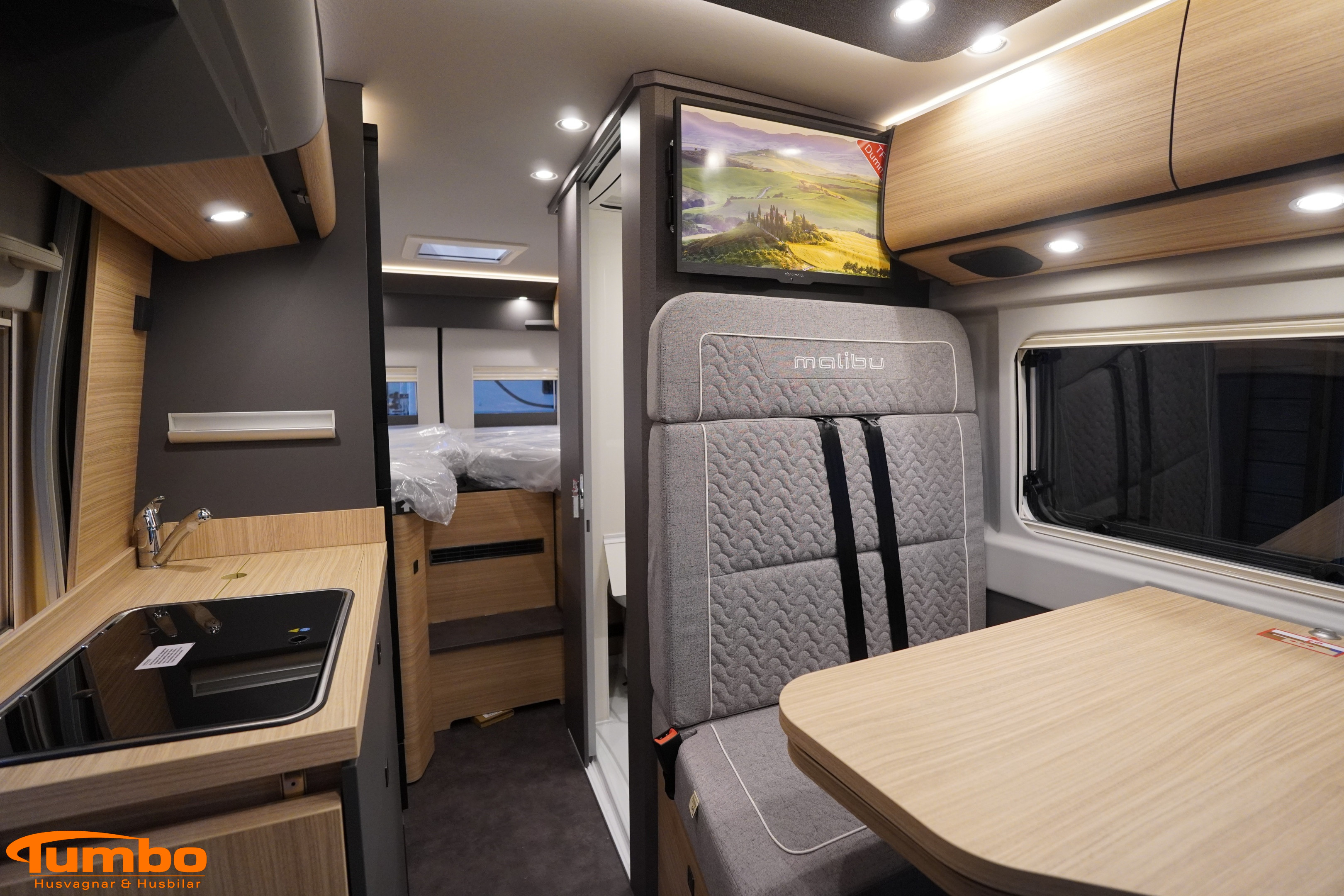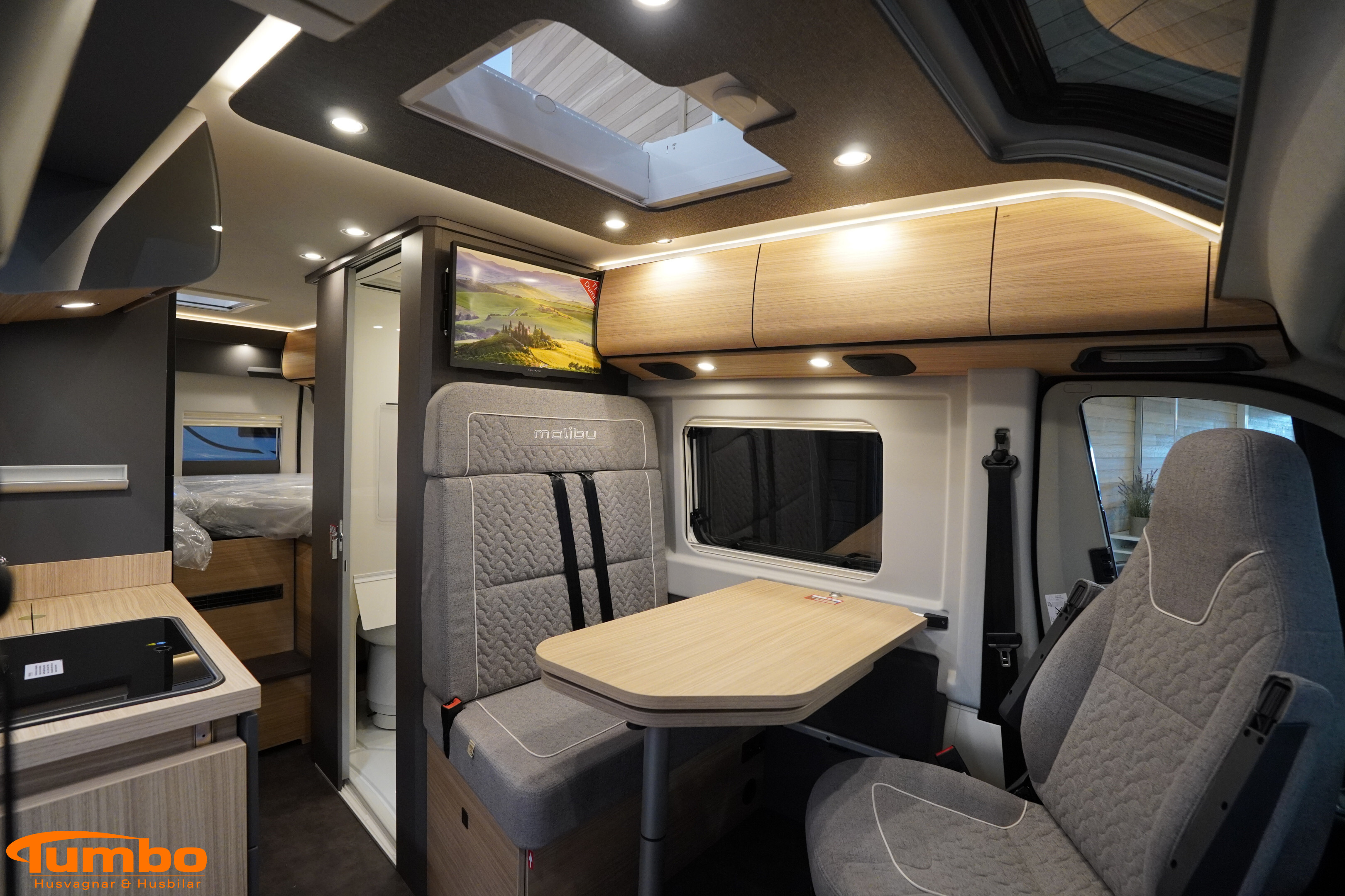 En ny husbil från Malibu, årsmodell 2026. Som har rullat 0 mil, Automatväxellåda med en 140 hk stark motor. Med plats för 3 passagerare och 3 sovplatser. Uppvärmining med Truma värme m. elpatron